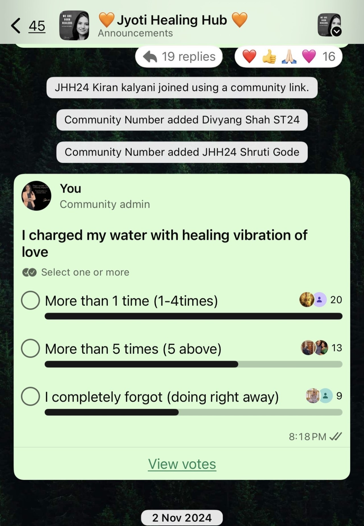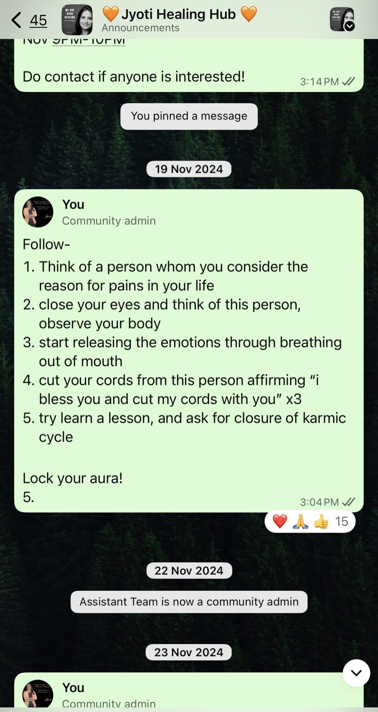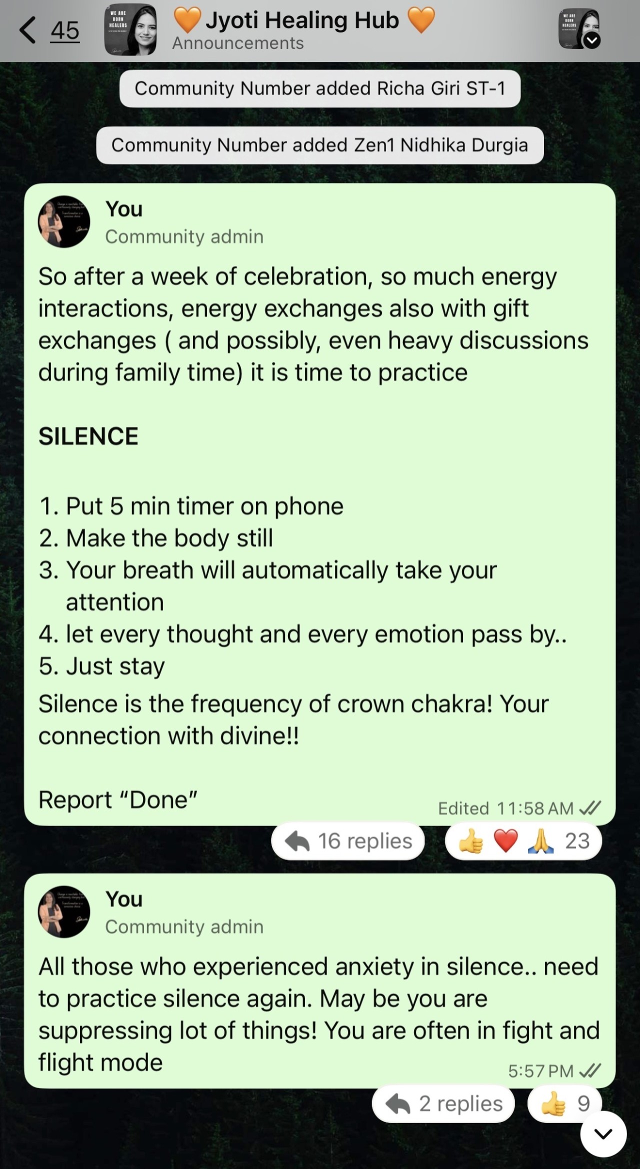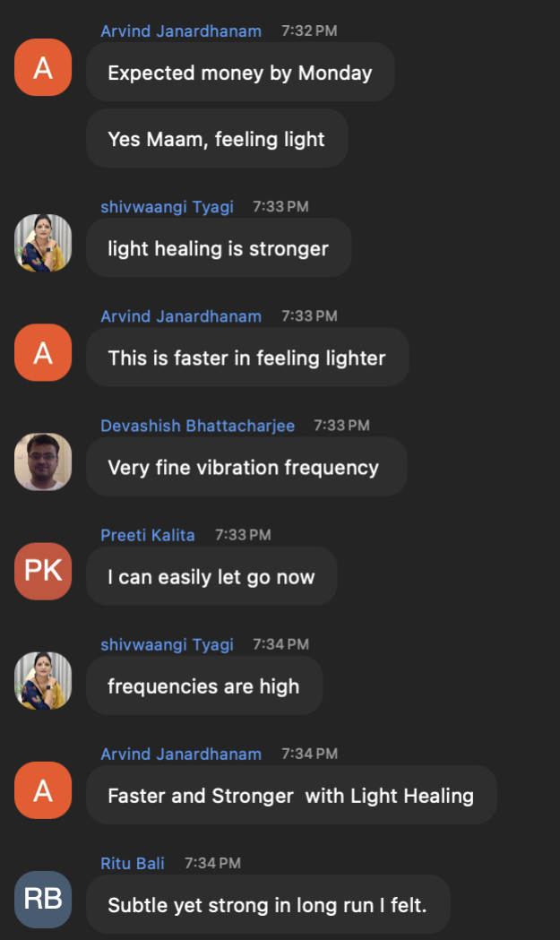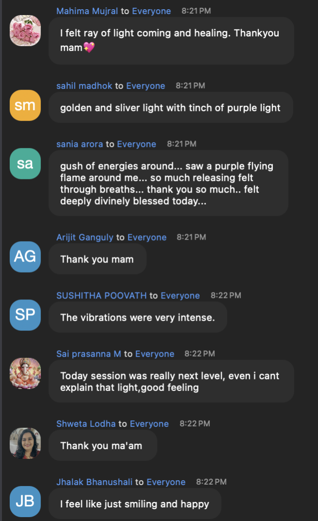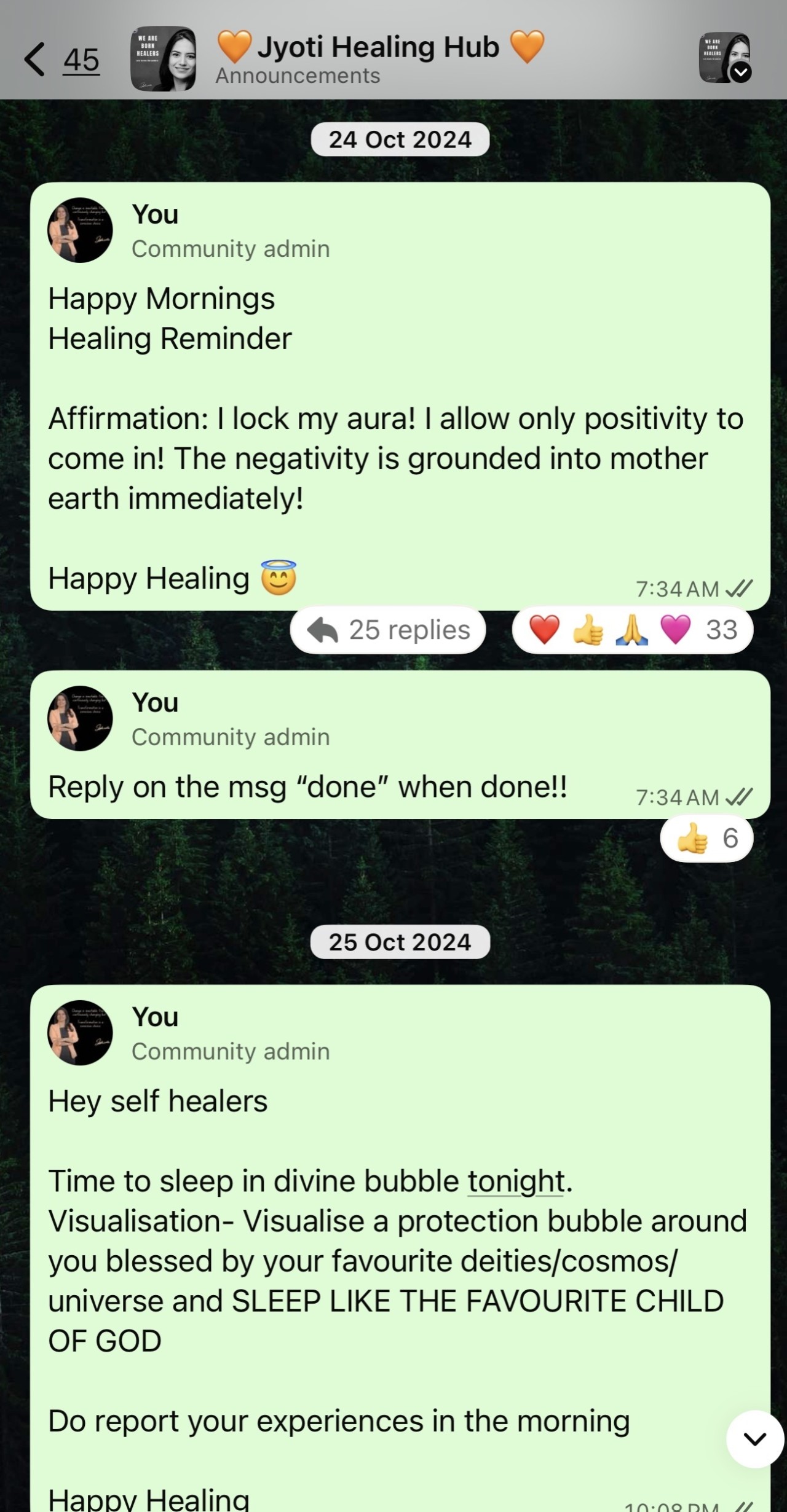 Jyoti Ma'am personally keeps sending methods, techniques, reminders in the group to keep you rooted as well as lifted just the perfect way. This community is a safe place for healers as well as people seeking healing. Most of the messages are either channeled or downloaded.